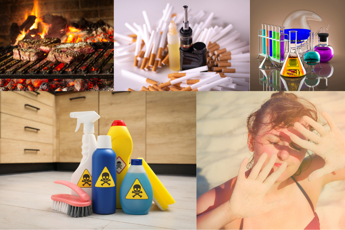 สารเคมี เช่น เบนซิน (Benzene) แร่ใยหิน (Asbestos) แคดเมียม (Cadmium) นิกเกิล (Nickle) พอลิไวนิลคลอไรด์ (Polyvinyl chloride) ยาฆ่าแมลง (Pesticides)