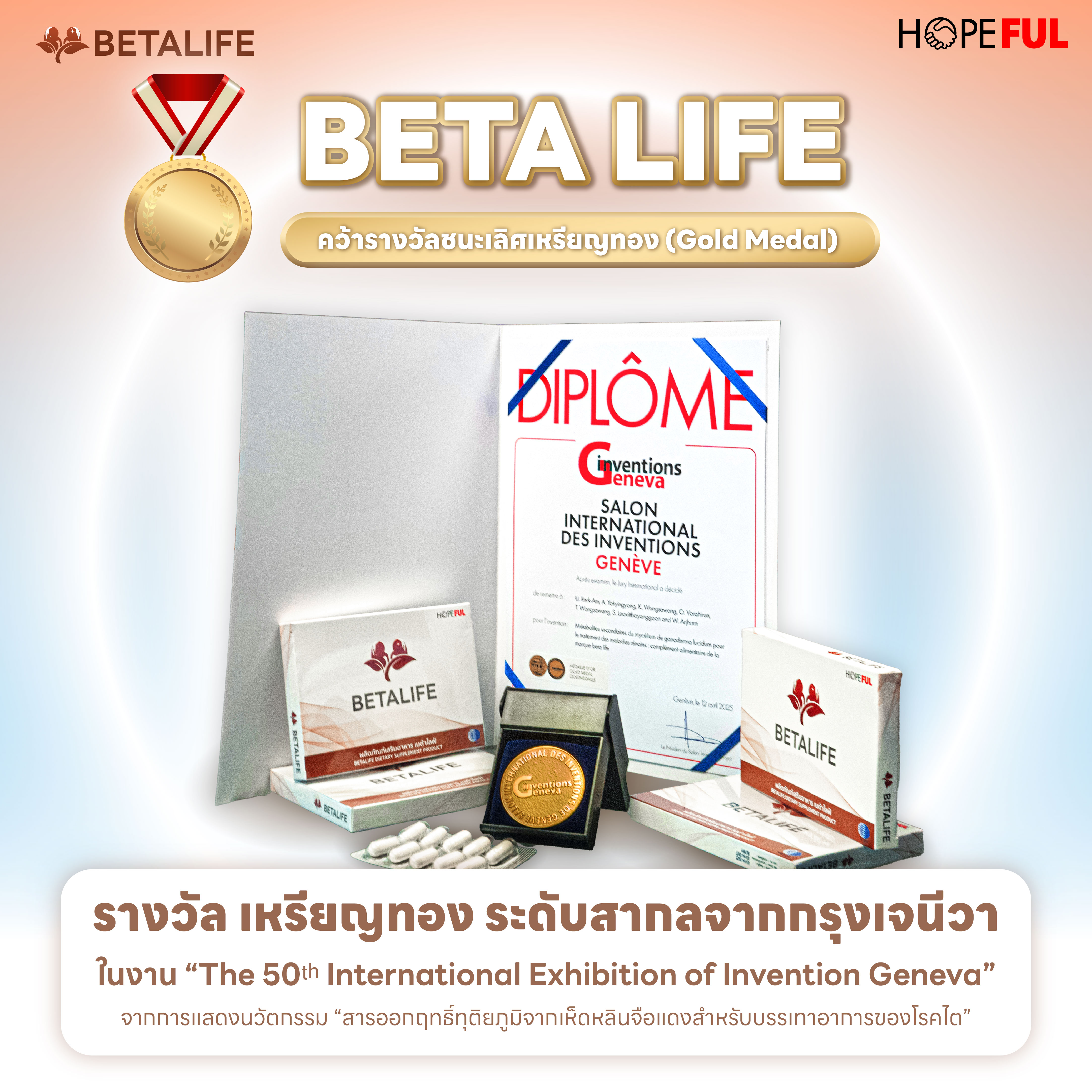 เบต้าไลฟ์ ได้รางวัล เหรียญทอง ระดับสากลจากกรุงเจนีวาในงาน "The 50t International Exhibition of Invention Geneva"จากการแสดงนวัตกรรม "สารออกฤทธิ์ทุติยภูมิจากเห็ดหลินจือแดงสำหรับบรรเทาอาการของโรคไต"