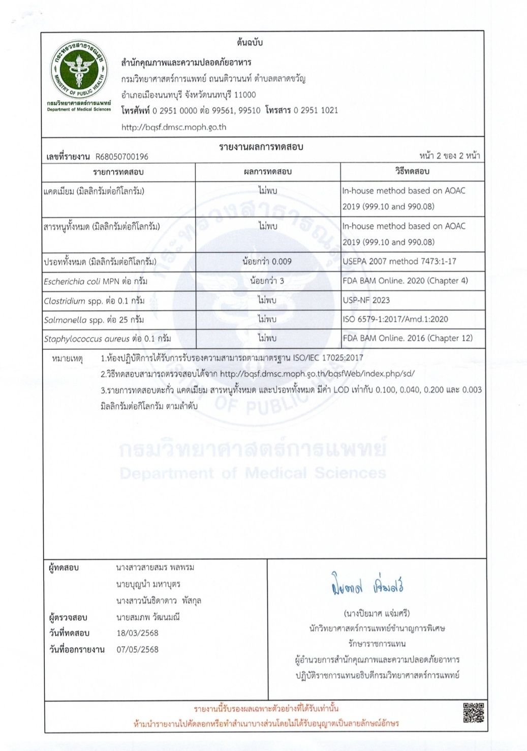 ผลการตรวจยืนยันว่าไม่มีการปนเปื้อนของโลหะหนัก (เช่น แคดเมียม, ตะกั่ว หรือปรอท) ในระดับที่ก่อให้เกิดอันตรายต่อร่างกาย